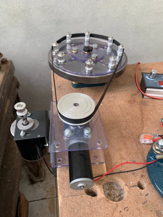 Bonjour, Bien que je ne fasse pas que çà, je m'y remets de temps en temps. Fabriquer une courroie GT2 : Il faut d'abord une certaine destérité que je n'ai pas. Il y a donc un point dur à la soudure mais cela passe les dents. Il existe l'autre solution de travailler avec de la courroie cylindrique en PU qui se soude à la chaleur plus facilement. Seulement il faut fabriquer des poulies pour courroie cylindrique ce qui est quand même facile à la CNC. J'ai fabriqué cet après midi des disques (pour d'autres usages) en contreplaqué de 18 mm et de 280 mm de diamètre. Cela se fabrique très facilement en toutes dimensions avec une précision remarquable (dont on n'a pas besoin) Moteurs : J'avais un moteur CC mais même avec une poulie motrice de 22 dents et un variateur de vitesse, il était trop rapide pour une oscillation de 1 tour /seconde. Par contre mon moteur CC avec réducteur était trop lent. Je lui ai donc mis une poulie d'une 60 aine de dents, et ce coup-ci, cela fonctionne très bien avec le variateur. Il n reste plus qu'à le fixer à la place de l'autre. Ah oui ! J'ai voulu une fois de plus mettre Chat-GPT à contribution, vous vous en doutesz c'est catastrophique. Deux cercles concentriques, c'est à dire avec un centre commun, il ne sait pas faire, il en est arrivé à me faire une jolie spirale. A+