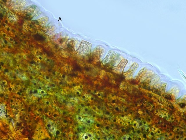 Discomycètes sur feuille de chêne ? Note de correction — Les structures initialement décrites comme Discomycètes se sont révélées être des galles de cynips (probablement Neuroterus quercusbaccarum). L’hypothèse fongique a donc été abandonnée, mais les observations et coupes restent utiles à titre documentaire. Tous les ans en automne les feuilles du vieux chêne au bas de la route se couvrent de taches - Toutes n’ont par la même forme indice ni la même couleur indices d'attaques multiples réalisées par des variétés de guêpes différentes. 3 formes sont présentes: . Chaque petit rond fait autour de 4 mm de diamètre et il est très facile de les décoller du limbe de la feuille. Sur cette première photo les formations sont marron-clair et aplaties. Il existe une autre forme dont les rebords sont bien marqués. Et une troisième forme plus claire et plus bombée Regard sur la face inférieure: En A est la seule zone qui a un contact avec le limbe de la feuille. Une coupe est réalisée : A Fixation sur le limbe de la feuille – B Limbe de la feuille C Coupe du parenchyme - une cavité est bien délimitée dans la base de la galle mais cette cavité est vide . D Ornementations Reste à trouver le nom de cette formation ou le nom de ces formations puisqu' il en a été trouvé 3 . Dominique