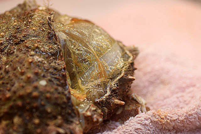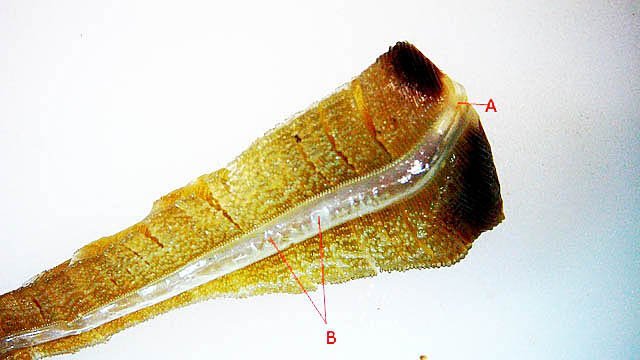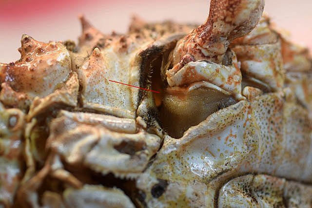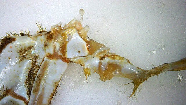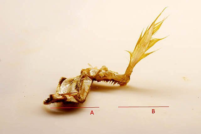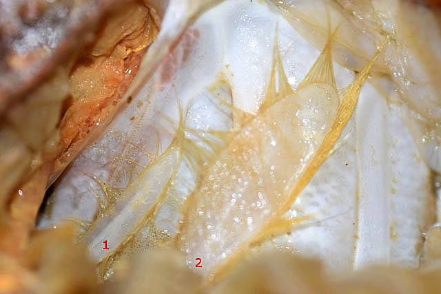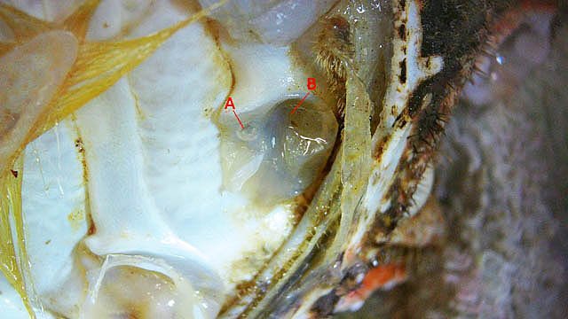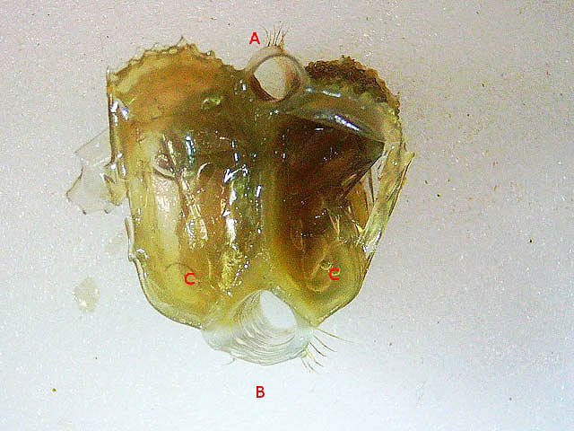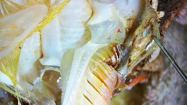 Système branchial du crabe (Araignée de mer) 1 Dans un premier article ont été présentés le cœur et le système vasculaire de l’ Araignée de mer .Dans les trois articles qui vont suivre on va essayer de comprendre 1 -l’ organisation anatomique du système branchial 2 l’ aspect histologique de ce système et dans 3 l’organisation de la répartition de l’hémolymphe oxygénée à travers le corps de ce crabe et en particulier l’ oxygénation des muscles des pattes sachant que le cœur tel qu’ il a été présenté n’ a pas la force de propulsion nécessaire pour cette fonction Cet article est illustré par le microscope à écran Tomlov Première partie - Anatomie du système branchial Arrivée de l’eau de mer -L’orifice d’entrée est assez vaste 1 cm x0,5 mm Cette arrivée est cachée à un examen rapide ; - il est nécessaire de pousser en arrière la première patte pour la découvrir . L’ eau de mer doit être isolée de l’ hémolymphe ; Il existe donc une cavité branchiale .La cavité branchiale est vaste 6 cm x7cm x 2cm.Cette cavité ( qui est bilatérale et située derrière la face latérale de la carapace est limitée par une membrane transparente très résistante qui est fixée sur les limites périphériques ( exosquelette ) et les limites du squelette interne. La carapace est enlevée ce qui permet de dégager le manteau dont le rôle est la synthèse de la carapace : Le manteau est enlevé -En dessous la membrane de la cavité branchiale est bien visible. Cette membrane limitant la cavité branchiale ; se soude sur les bords du squelette interne et sur la face interne de la carapace de manière totalement imperméable . Si cette membrane est enlevée les arcs branchiaux sont bien visibles - Ils sont au nombre de 7 leur taille est variable le plus grand fait 6 cm de haut et 1 cm de large à leur base. Sur la face antérieure du massif branchial existe des structures riches en poils qui font à la fois jouer le rôle de brosse et de mise en mouvement de l’ eau de mer. Sur la face antérieure du massif branchial il existe une formation rameuse importante. Les lames 1 et 2 sont elles situées sur la face postérieure du massif branchial - La plus grande est animée d’un mouvement d’essuie-glace Ce mouvement provient des scaphognathites qui sont des exopodites du deuxième maxille des crustacés, jouant un rôle crucial dans la respiration en agitant l'eau dans les compartiments branchiaux. ( ce mouvement constant est bien visible si le crabe est vu dans un aquarium ) . A partie visible située en avant de la bouche // B partie invisible située dans la cavité branchique. Détail sur l' organisation . Les Branchies Elles sont au nombre de 7 pour chaque massif branchial ( massif droit et massif gauche ) Chaque élément est de forme triangulaire . et apparaît comme un empilement de lamelles Sur l’ axe médian de cette structure courre un gros vaisseau bien visible Face anterieure : A Le vaisseau va de l’ extrémité distale vers la base et se courbe vers le réservoir récepteur B Nombreuses bulles d’ oxygéne Les deux vaisseaux ne forment pas un circuit avec une anastomose à leur sommet. les deux vaisseaux sont séparés à leur extrémité distale Les deux vaisseaux se jettent dans la même structure située à la base B Vaisseau postérieur C Surface d une des lamelles – chaque structure branchiale est constituée de l’empilement de centaines de lamelles. ( voir présentation histologique ). A arrivée des vaisseaux antérieurs et B arrivée du vaisseau postérieur Ce réservoir inferieur est fixé sur un passage qui conduit vers la partie interne du crabe Cette partie interne où sont réunis tous les organes ne contient pas d’eau de mer mais de l hemolymphe . A Manchon isolant de tout échange entre la cavité branchique et la cavité péricardique ( voir article sur le cœur ) qui contient l’ hémolymphe. Si on ouvre ce manchon : A Passage vasculaire correspondant au drainage de la branchie ( on remarquera qu il n’ y a qu’ un vaisseau par branchie ) et non deux ce qui aurait été le signe d’un mouvement circulaire de l’ hemolymphe ) B Membrane imperméable qui sépare la cavité branchiale de la cavité péricardique et qui maintient la branchie fixée à sa base. Une fois l’échange oxygène /gaz carbonique l’eau doit ressortir Si l’entrée a été facile à trouver la sortie est beaucoup plus cachée Elle est située en profondeur derrière les scaphognatites de la zone buccale à la base des deux dents. ( la sonde montre le trajet). Cette sortie est de la même taille ,à la base de la carapace que l’entrée soit 1cm X 0,7 cm Elle se situe en arrière du système buccal -Cette position est extrêmement avantageuse – -- elle empêche la pénétration de restes alimentaires dans la cavité branchique - -- elle lave le système buccal et les scaphognathites La seconde partie va présenter l’ aspect histologique de cette organisation La troisiéme va essayer de répondre aux questions du mécanisme de fonctionnement de ce système A- Irrigation des branchies puisque les vaisseaux ne font pas de circuit B Irrigation de pattes jusqu’ à leur extrémité distale puisque vu la taille du cœur il lui est impossible de jouer un rôle propulseur .assez puissant A suivre Dominique