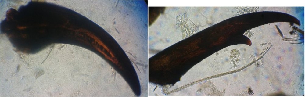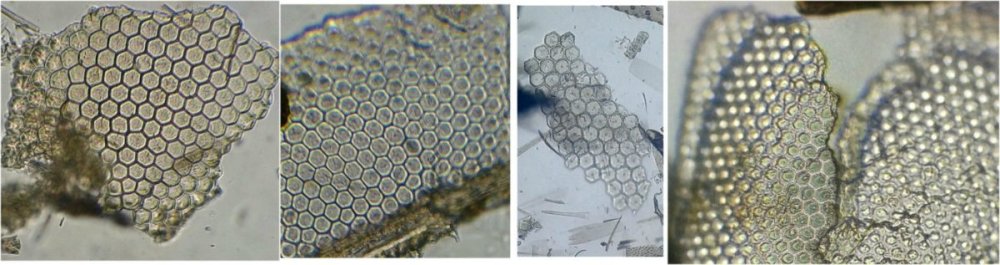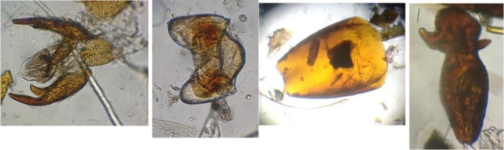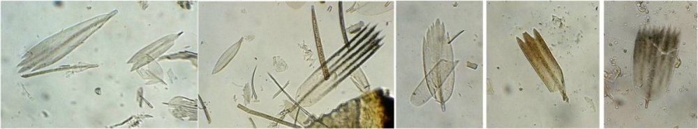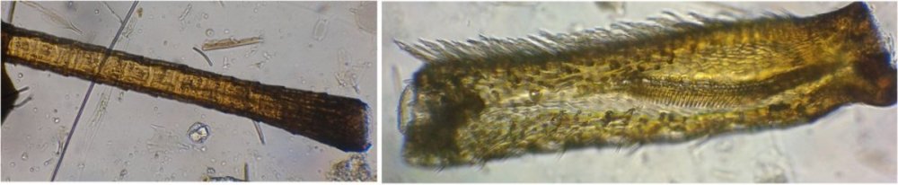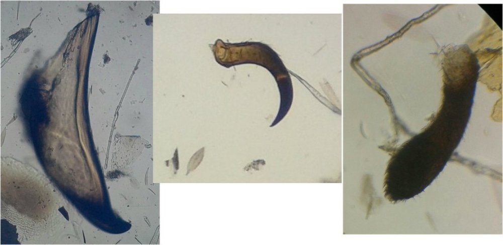 Il fait trop chaud pour aller chercher des échantillons, mais parfois ceux ci tombent littéralement du ciel ! En effet tous les matins des hirondelles tournent dans ma cour, se posent sur les fils à linge, gazouillent à tue tête, et parfois, en s’envolant, laissent un petit cadeau : Voici donc sur une feuille du figuier une fiente qui mesure environ 1,5 cm. En la diluant dans de l’eau , surtout la zone foncée, révèle un grand nombre de parties d’insectes. Sachant que les oiseaux n’ont pas de dents on peut s’interroger sur ce qui permet d’obtenir de si petits morceaux. Je pense que leur gésier doit contenir des particules de sable qui permettent la mastication. N’étant pas entomologiste pour deux sous, je ne m’avancerai pas sur l’identification des insectes ingérés, mais contrairement à ce qu’on pense ce ne sont pas que des moustiques ! Il peut être utile d’utiliser une mini goutte de liquide vaisselle pour aider à mouiller les morceaux de kératine . A défaut d’identification on peut toutefois regrouper les structures par fonctions . Sauf mention contraire les images sont faites au x 15 : Les écailles d’ailes : on remarque la présence d’écailles longues et fines provenant certainement d’ailes de moustiques mais aussi d’autres types d’écailles : Des fragments d’ailes où l’on distingue les pédicelles d’attache des écailles Voir ici : https://forum.MikrOscOpia.com/topic/19533-%C3%A9caille-des-papillons/#comment-81091 Des pattes difficiles à identifier car très morcelées des cornées faciles à reconnaître par leurs éléments hexagonaux des fragments d’épiderme ou d’élytres avec des ornementations circulaires et des poils aux centre de chacune des griffes / mandibules / palpes
