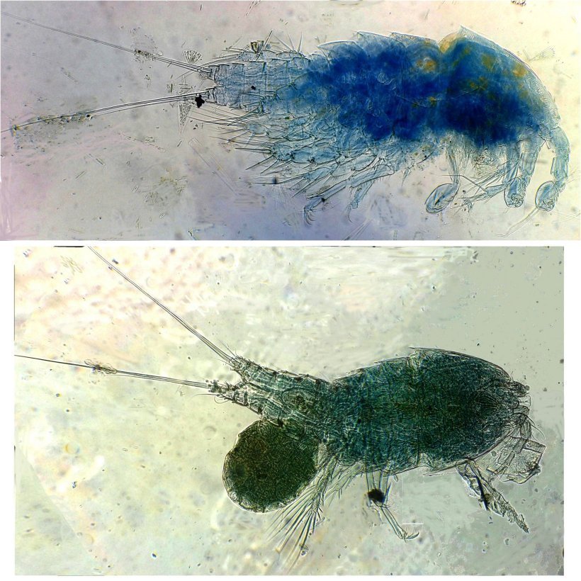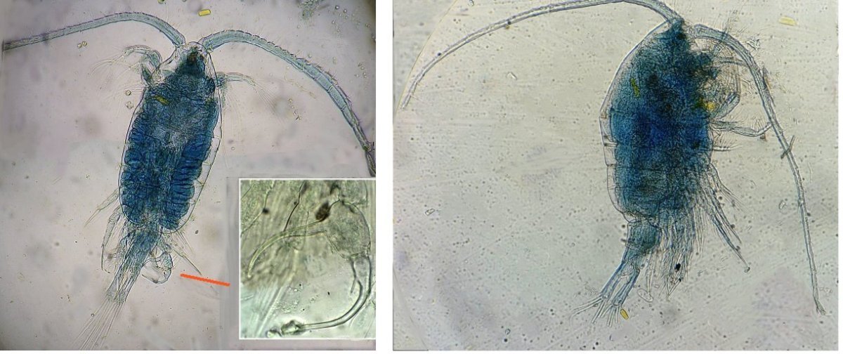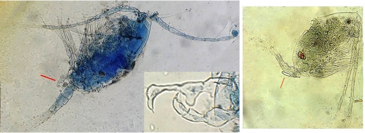 Jean Marie Cavanihac Posté(e) il y a 20 heures Signaler Posté(e) il y a 20 heures Les copépodes, sont de petits crustacés, qui constituent une grande partie du zooplancton ; ils représentent 12000 espèces où l’on distingue 10 ordres . Dans les prélèvements au filet à plancton (ici maille de 200 µm), le nombre de copépodes recueillis est très important en particulier les mois d’été. En prenant quelques précautions : conservation au frais de l’échantillon et observation rapide (entre 2 et 3 heures après prélèvement), de nombreux spécimens peuvent être observés vivants. Cependant en raison de leur nombre élevé, la concentration en oxygène baisse rapidement dans le flacon et vient ralentir leurs mouvements : il tombent au fond en constituant une « soupe » de copépodes et le prélèvement d’une seule goutte de ce dépôt ramène plus d’une dizaine de spécimens sur la lame. Dans l’image ci dessous , il faut donc diluer ! Ce grand nombre de spécimens va permettre de les figer en diverses positions et sur la quantité présente on peut trouver le mâle et la femelle . Pour les conserver : fixation au picroformol de Bouin directement sur lame, coloration par le vert de bromocrésol (pas vraiment un colorant mais un indicateur de pH) et montage à la gélatine glycérinée. J’ai ainsi réalisé plusieurs lames sur plusieurs années successives . Ceci fait je remets les reste du flacon à l’eau pour nourrir les alevins de poissons ... J’ai un peu négligé de m’intéresser plus tôt aux copépodes car je recherchais des sujets plus rares. En reprenant 6 ou 7 lames, dont certaines datent de 20 ans, j’ai pu identifier plusieurs espèces homogènes en quantité dans les échantillons. Voici quelques définitions de la morphologie des copépodes qui vont être utiles pour la suite : de plus , dans le texte, les mots repérés par « * » renvoient au lexique en fin d’article L’une des lames observées montrait un spécimen de l’ordre des calanoïdes, reconnaissables à leurs longues antennules* ; dont une des pattes de la dernière paire (P5) était largement modifiée en forme de pince : Ce dimorphisme sexuel est adapté à leur reproduction. La flèche rouge montre P5 modifiée et la flèche bleue une autre caractéristique du spécimen mâle : la présence d’une antennule géniculée* utilisée dans l’accouplement. La femelle ne possède pas d’antennule modifiée, les 2 sont identiques . P5 en forme de pince différente de celle du mâle :voici la femelle et la pince en détail : (S : spermatophore * ) Il est recommandé de lire ces liens pour voir plus en détail les modalités d’accouplement. https://forum.MikrOscOpia.com/topic/20108-reproduction-du-cop%C3%A9pode-paracartia-grani/#comment-83424 https://forum.MikrOscOpia.com/topic/20116-copépode-calanus-arcatia-arcaturia-clausi/#comment-83460 Les deux autres spécimens ci dessous sont de l espèce acartia grani (Male à gauche et femelle à droite). La pince du male est similaire à celle de pacartia grani mais semble moins sophistiquée. (détail à l’ objectif x40) La femelle n’a pas de pince à la différence de celle de paracartia on voit sur l’image à droite le spermatophore * collé sur l ‘ urosome de la femelle (flèche rouge) avec détail ci dessous à l’objectif x 40 Troisième espèce : Centropages ordre des calanoïdes aussi . La pince du male (photo de droite) est plus fine. On remarque aussi l’antennule géniculée * sur la droite du mâle une épine asymétrique sur la femelle (flèche bleue) orienterait vers centropages hamatu ; noter l’ovipore * (flèche verte)